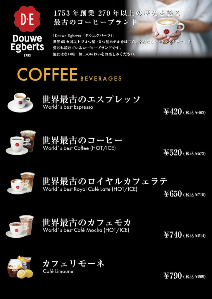 世界最古のロイヤルコーヒーブランド「ダウエグバーツ」や全国1%未満の贅沢なジャージー牛乳を使用したコーヒー、マイティーリーフを使用したハーブティー等、多種多様なお飲み物をご用意しております。